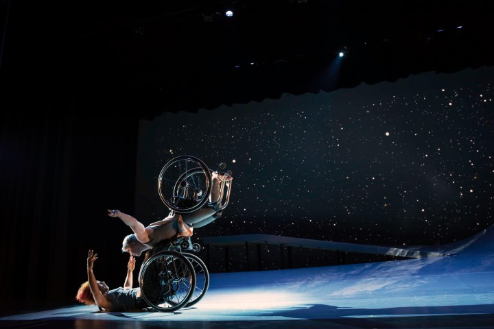 Descent is a two act disability arts performance that tells the story of Venus and Andromeda. In Roman mythology, Venus is a goddess born from the sea, and becomes well known for her beauty, while in Greek mythology Andromeda is a noble woman whose mother claims her to be more beautiful than the sea. This claim angers Poseidon, the god of the Sea, and he floods their city. These two unconnected mythical figures are brought together by Kinetic Light’s interpretation of Auguste Rodin’s Toilette of Venus and Andromeda. Rodin’s 1886 sculpture casts Andromeda clinging to what appears to be a cliff or ledge and presents Venus as looking up to the heavens with her hands on her head. In the sculpture, the pair look distressed and tension seems to rule their relationship. Kinetic Light incorporates this tension throughout Descent while also evolving it into a complex interracial love story that centers queerness and disability.